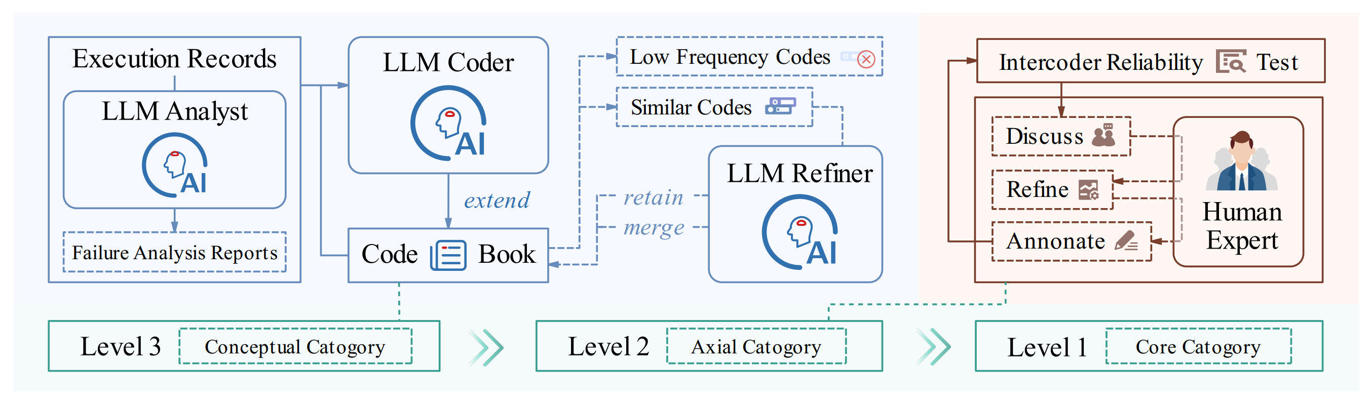Failure taxonomy construction: DEFT was built using grounded theory with human-LLM collaborative coding across approximately 1,000 generated reports. The taxonomy identifies failures like Strategic Content Fabrication (19% of errors), Insufficient Information Acquisition (16.3%), and Lack of Analytical Depth (11.1%).