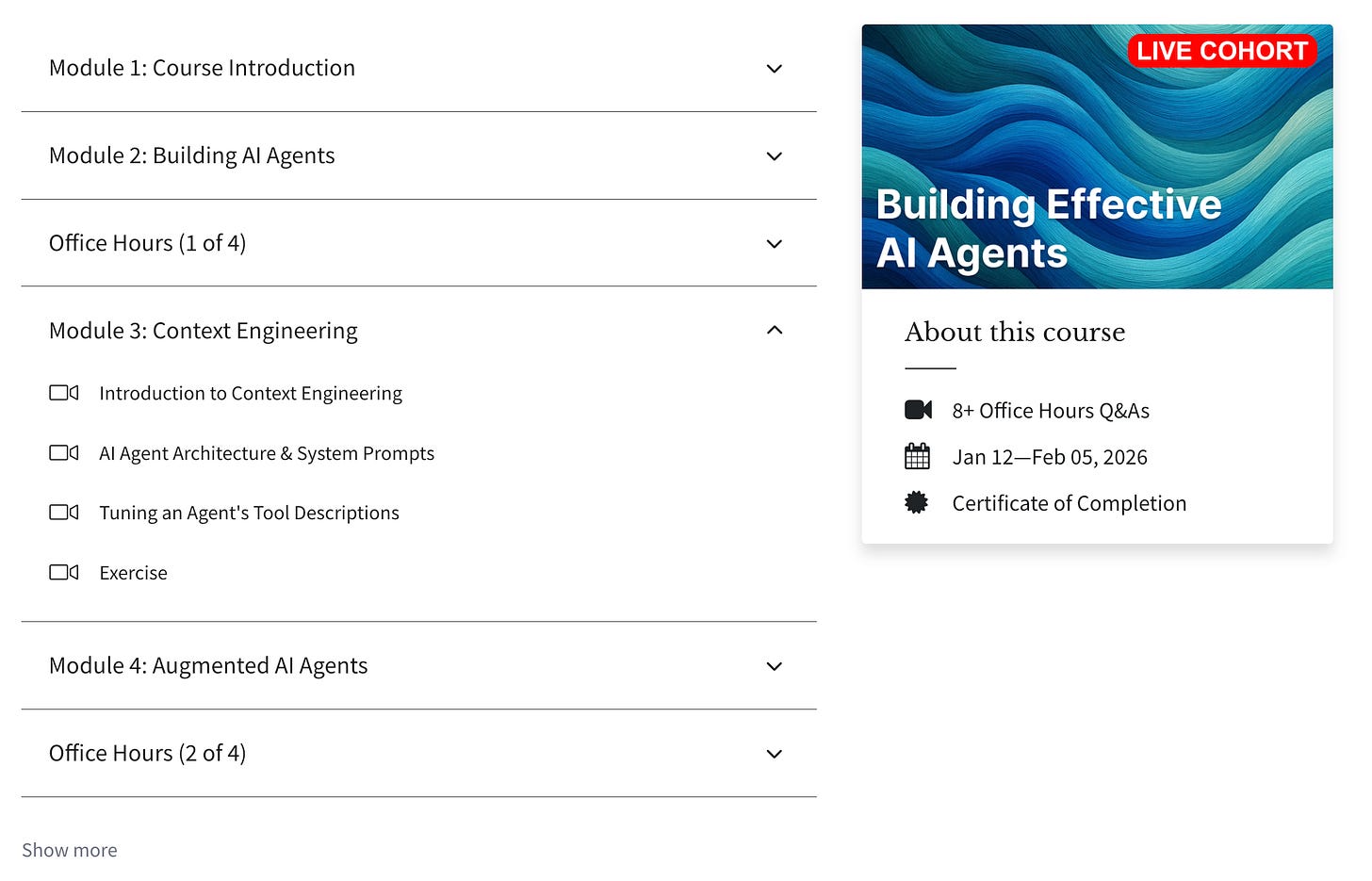 We are excited to announce our second cohort on how to build effective AI agents. Learn how to apply context engineering and build effective multi-agent systems for the real world.