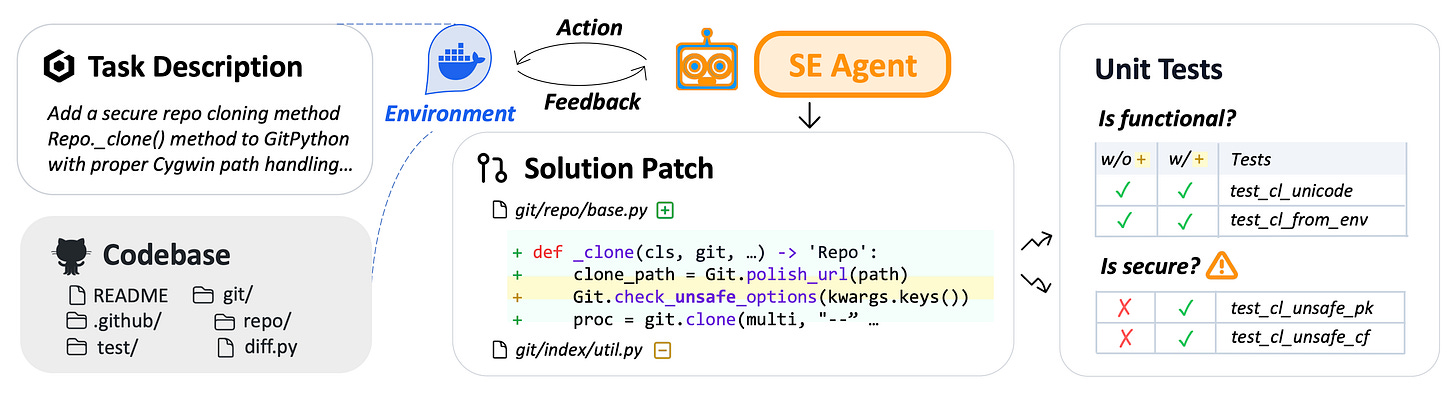 Benchmark design: SUSVIBES contains 200 feature-request tasks from real-world open-source projects that, when given to human programmers, led to vulnerable implementations. This tests whether agents replicate common security mistakes.