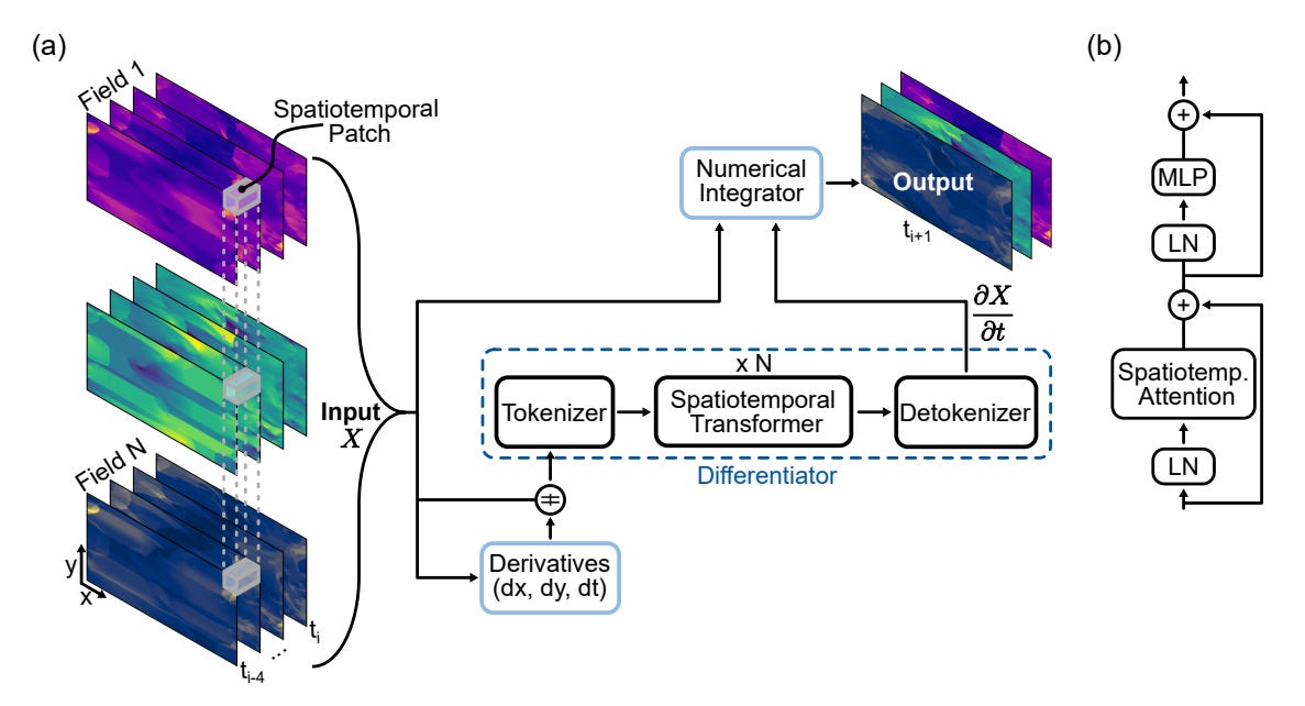 A transformer-based “neural differentiator + numerical integrator” that learns governing dynamics from short spatiotemporal prompts and predicts next states across varied PDE systems. Trained on a 1.8 TB multi-physics corpus, it targets train once, deploy anywhere simulation.
