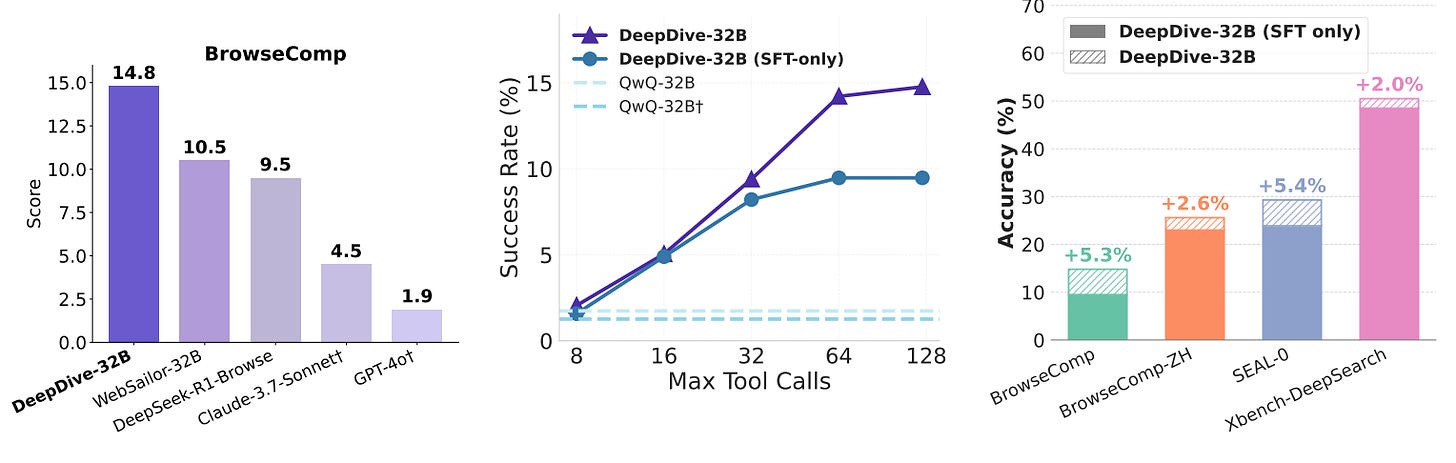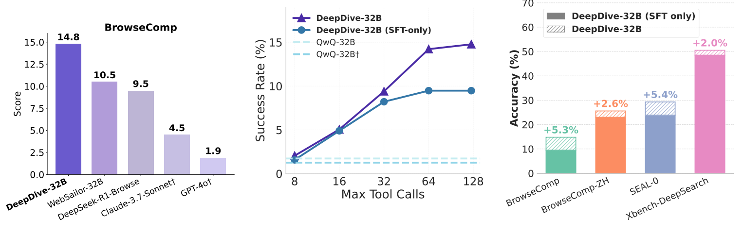 Strong open-source results. DeepDive-32B scores 14.8% on BrowseComp and 25.6% on BrowseComp-ZH, outperforming open agents like WebSailor, Search-o1, and DeepSeek-R1-Browse; SFT-only variants trail RL-trained ones.