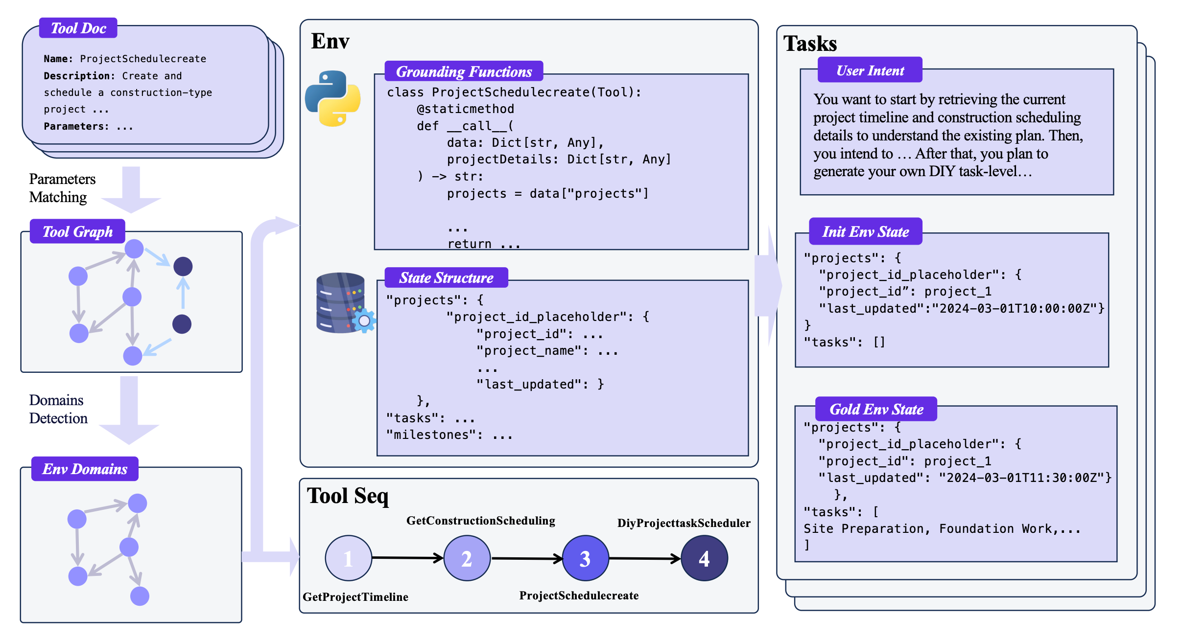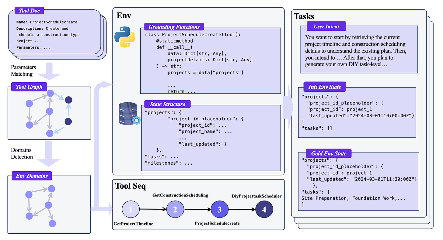 Scalable environment construction: Tools are clustered by parameter compatibility with Louvain community detection, each domain gets a database schema, and functions are implemented as code that reads or writes state. A domain tool graph is sampled to create coherent tool sequences and initialize states, enabling verifiable executions.