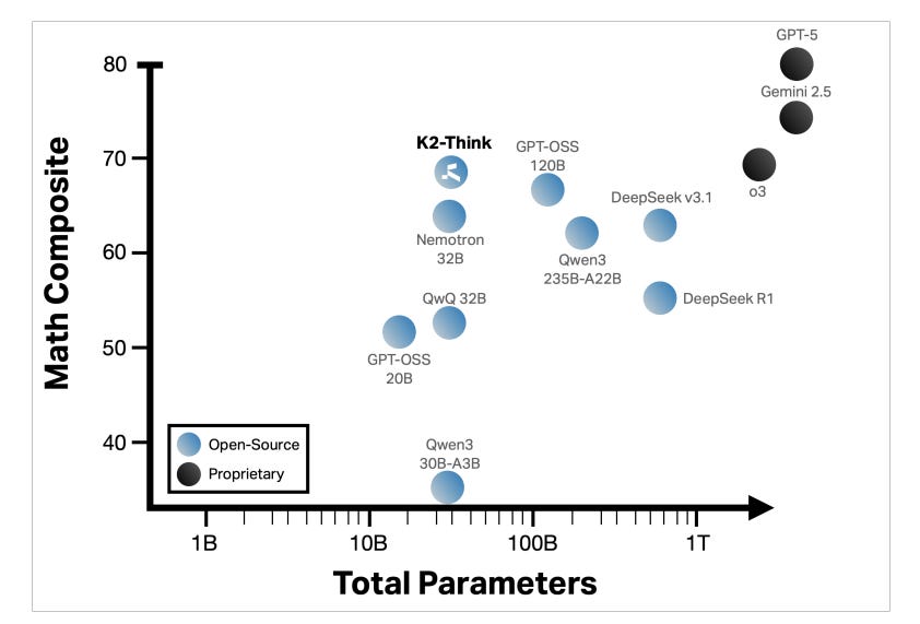 Frontier math at small scale. On AIME-24/25, HMMT-25, and Omni-MATH-HARD, K2-Think achieves a math micro-average of 67.99, exceeding open baselines like DeepSeek v3.1 and GPT-OSS 120B, while using a fraction of the parameters.