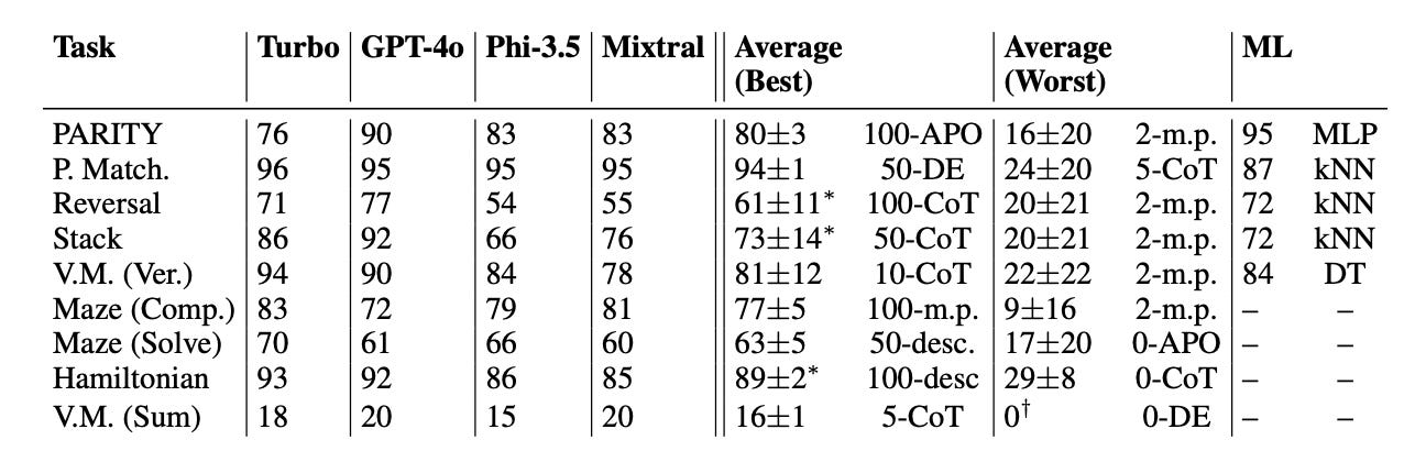 Mixed task competence and classical baselines. Some regular-language tasks are essentially solved (Pattern Matching ≈94% ±1), while others remain hard (Reversal, Maze Solve, Vending-Machine Sum). Closely related tasks can differ by up to 31% in peak accuracy. Simple ML baselines (DT, kNN, MLP) beat ICL’s average on roughly half the tasks.