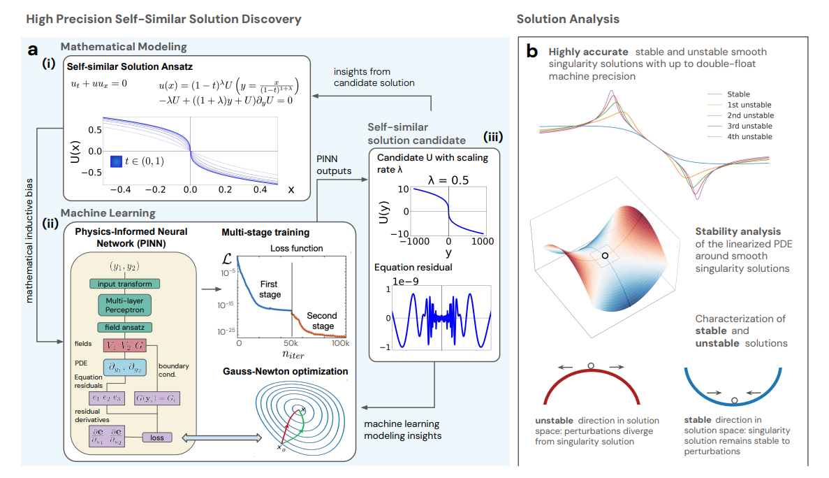 How they did it. They reformulate each PDE in self-similar coordinates, embed symmetry and decay constraints directly in the network outputs, and train physics-informed neural networks with a full-matrix Gauss-Newton optimizer plus multi-stage refinement to drive residuals down to 10⁻¹³ for certain CCF solutions.