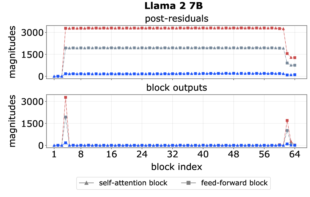 Practical implications for efficiency: Understanding these phenomena has direct consequences for model compression, quantization, and KV-cache optimization. Many efficiency techniques fail silently when they inadvertently disrupt massive activations or attention sinks, and this paper explains why.