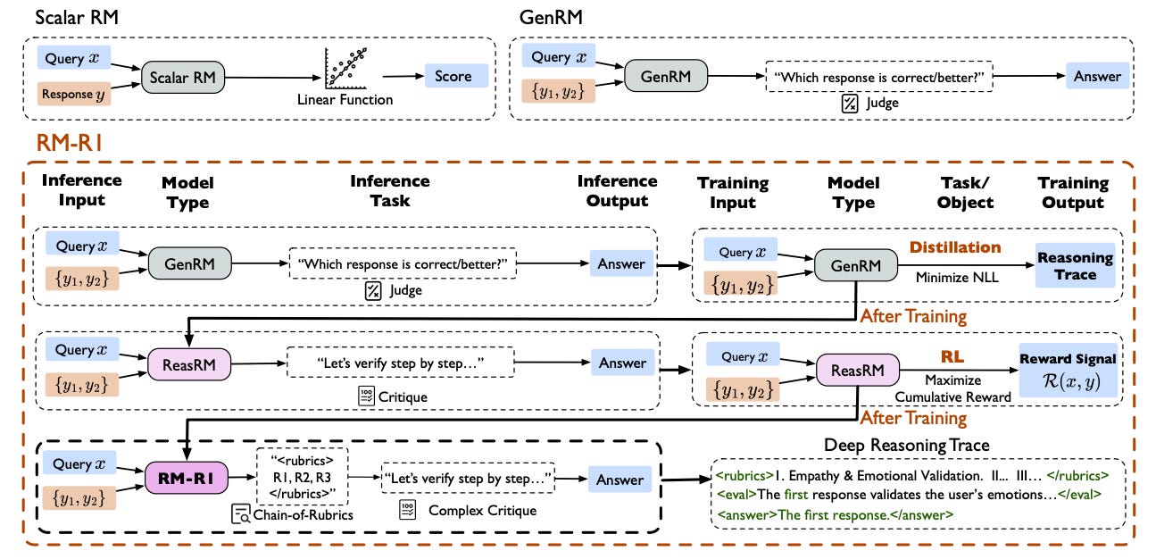 This work proposes a new class of reward models, called ReasRMs, that reformulate reward modeling as a reasoning task. The authors introduce RM-R1, a family of generative reward models that produce interpretable reasoning traces and rubrics during preference judgments. Instead of relying on scalar scores or shallow generation, RM-R1 models leverage structured reasoning and reinforcement learning to improve both interpretability and performance across benchmarks.