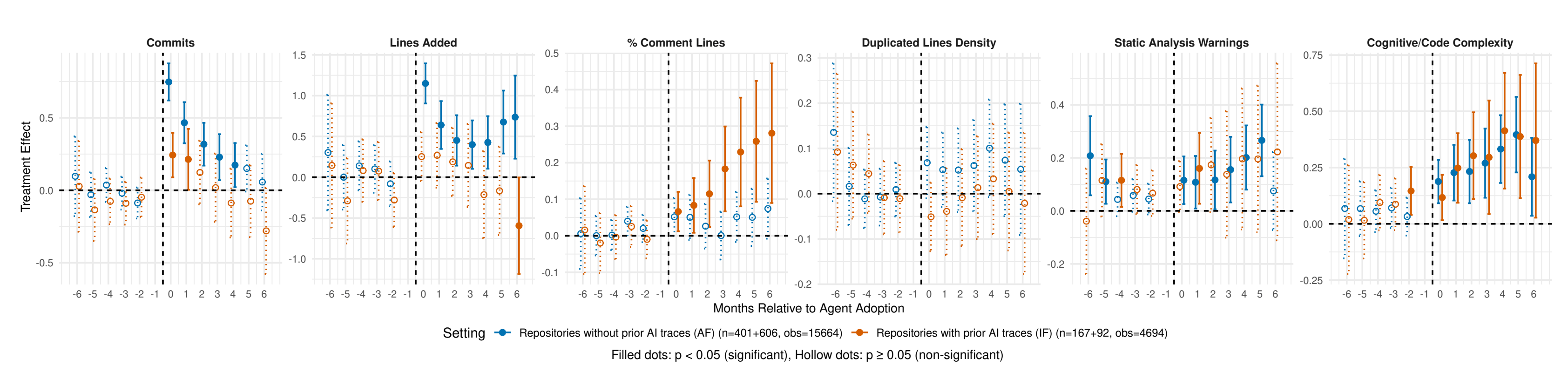 First-mover effects: The research differentiates effects based on whether agents represent a project’s first exposure to AI tooling versus augmenting existing assistance, finding that the sequence of adoption matters significantly.