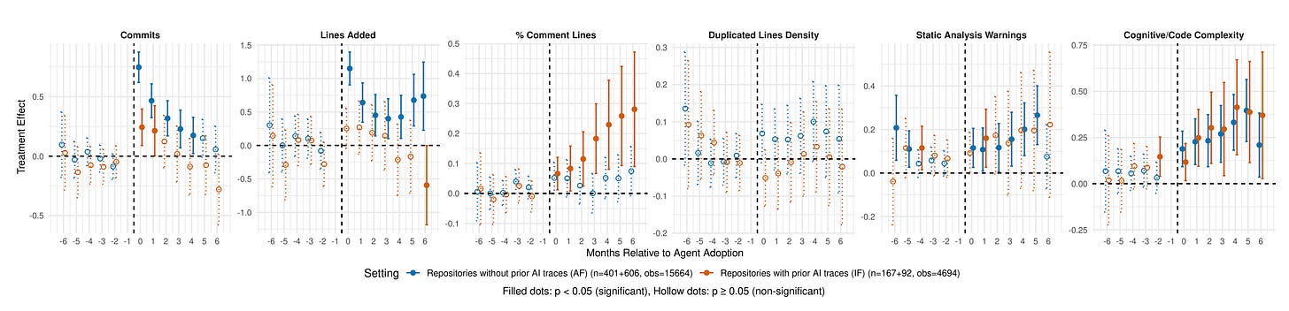 Velocity gains are conditional: Substantial upfront acceleration occurs only when autonomous agents are a project’s first AI tool. Projects already using IDE assistants see minimal additional productivity benefits from adding autonomous agents.