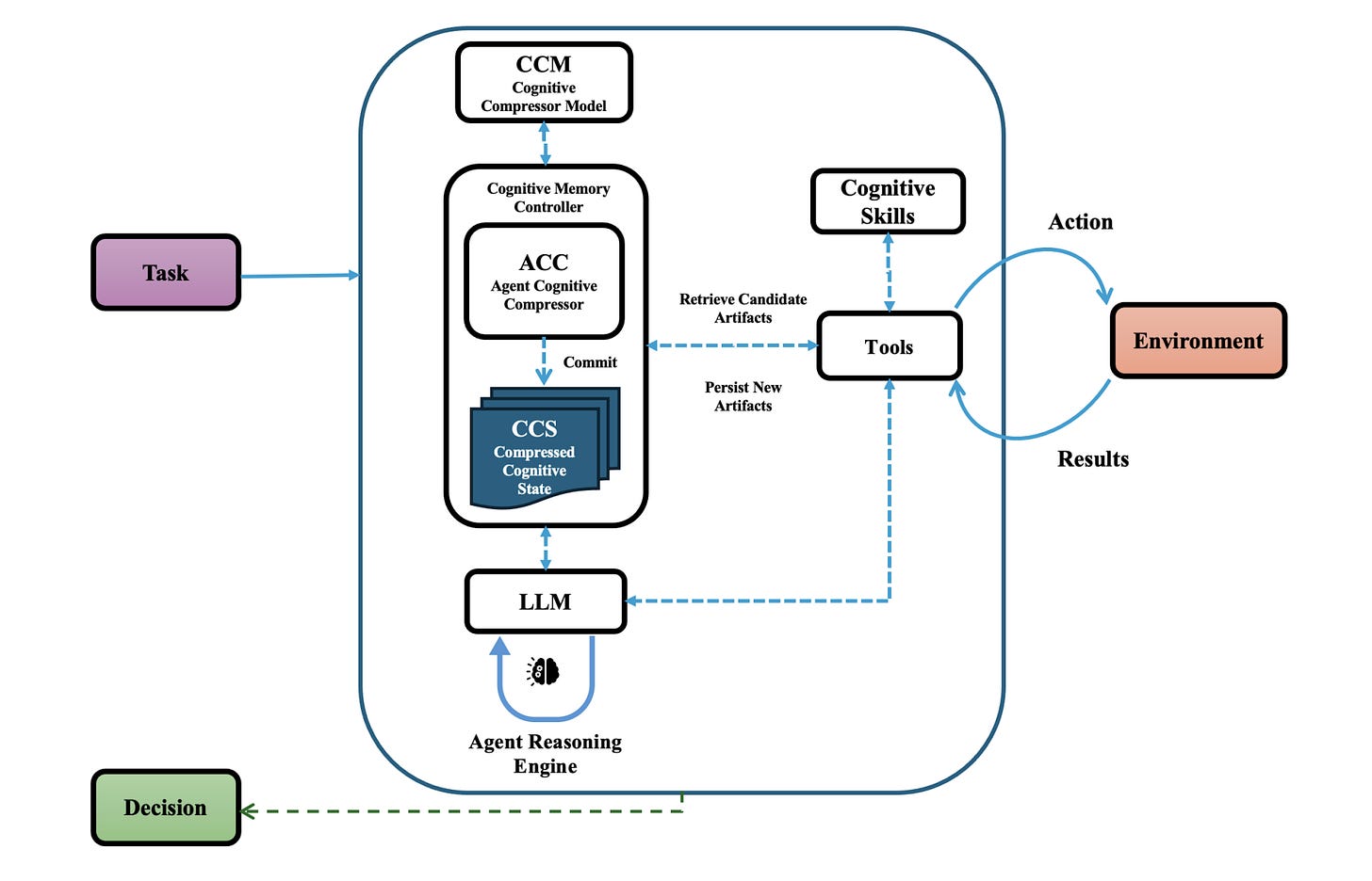 Bio-inspired bounded memory: Drawing from biological memory systems, ACC maintains a bounded internal state rather than continuously growing context, enabling stable performance without the computational costs of ever-expanding transcripts.