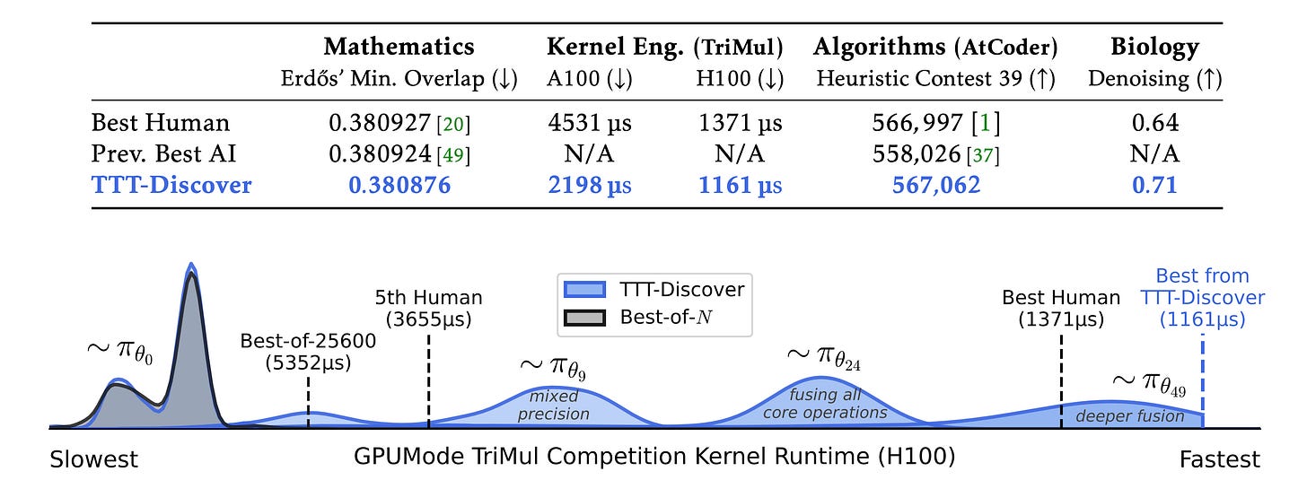 State-of-the-art across domains: TTT-Discover sets new records on Erdős’ minimum overlap problem, an autocorrelation inequality, GPUMode kernel competitions (up to 2x faster than prior art), AtCoder algorithm competitions, and single-cell denoising in biology.