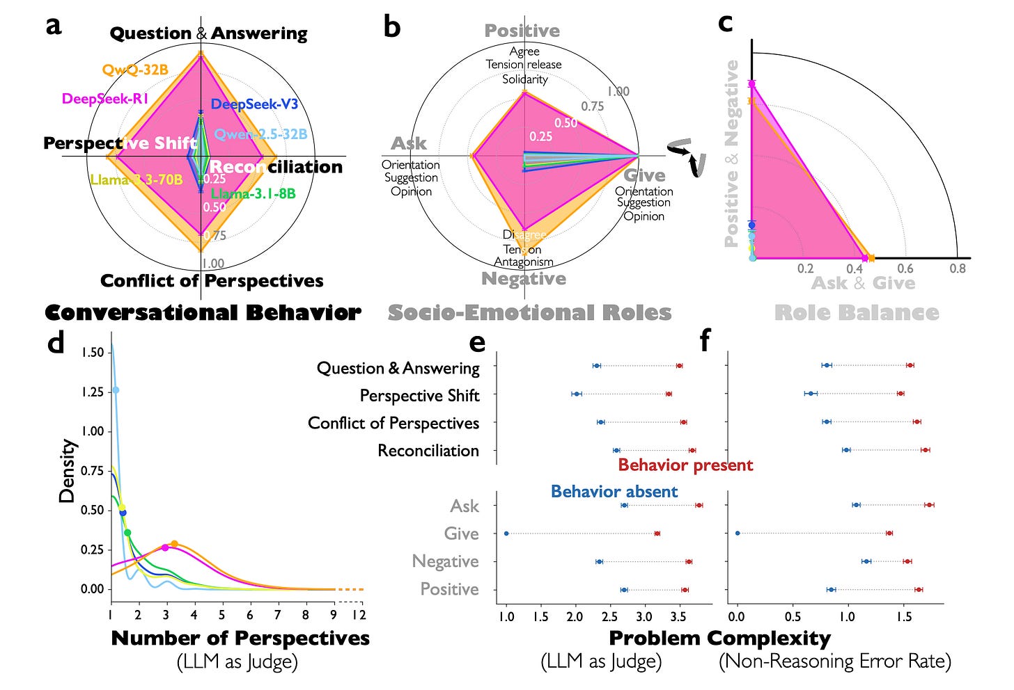 Conversational behaviors drive accuracy: The multi-agent structure manifests in question-answering, perspective shifts, and reconciliation of conflicting views. These socio-emotional roles characterizing back-and-forth conversations account for the accuracy advantage in reasoning tasks.