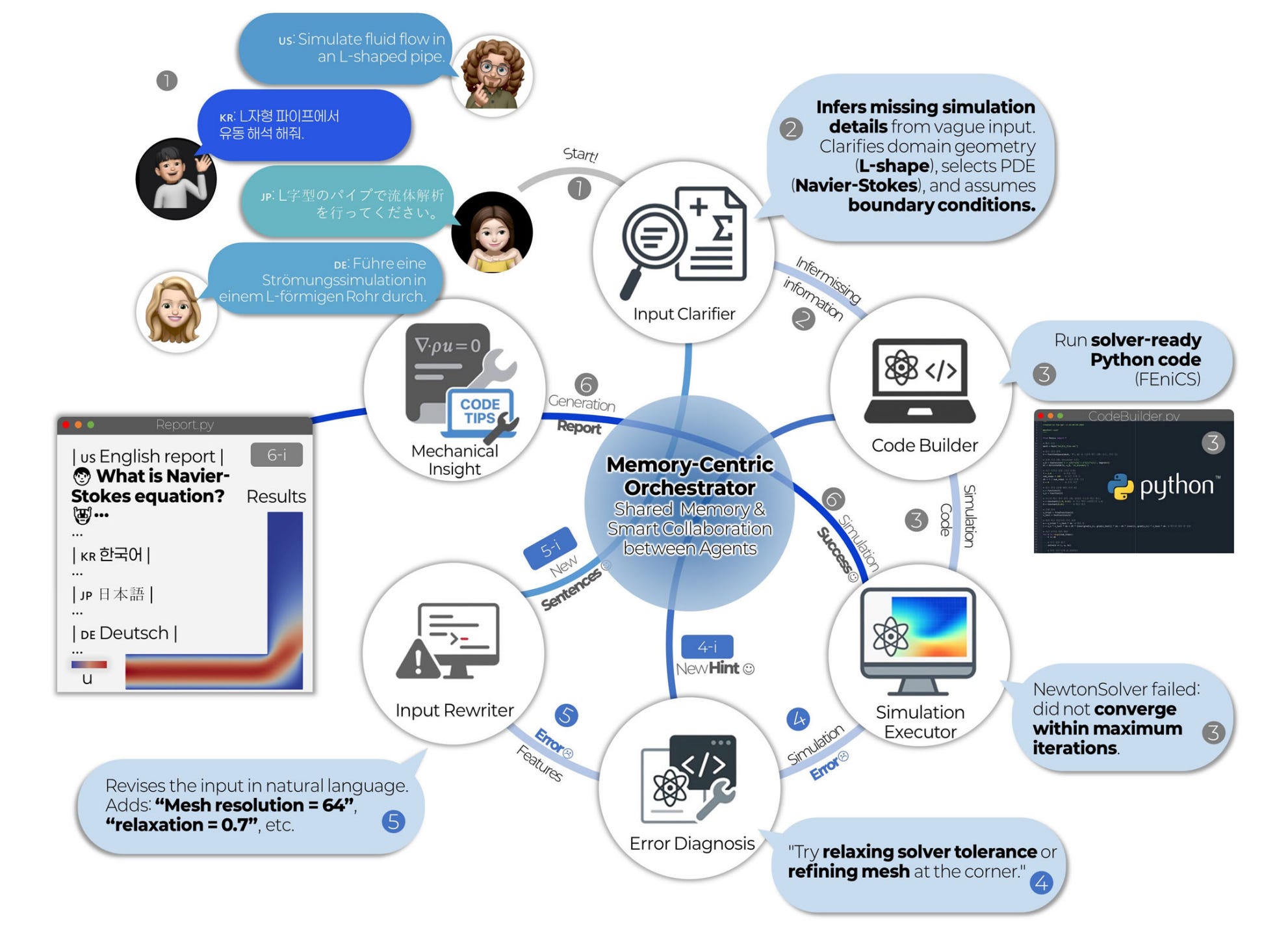 Self-correction mechanism: Built-in self-correction capabilities allow the system to identify and fix errors in generated simulations, improving accuracy without requiring human intervention or additional training.