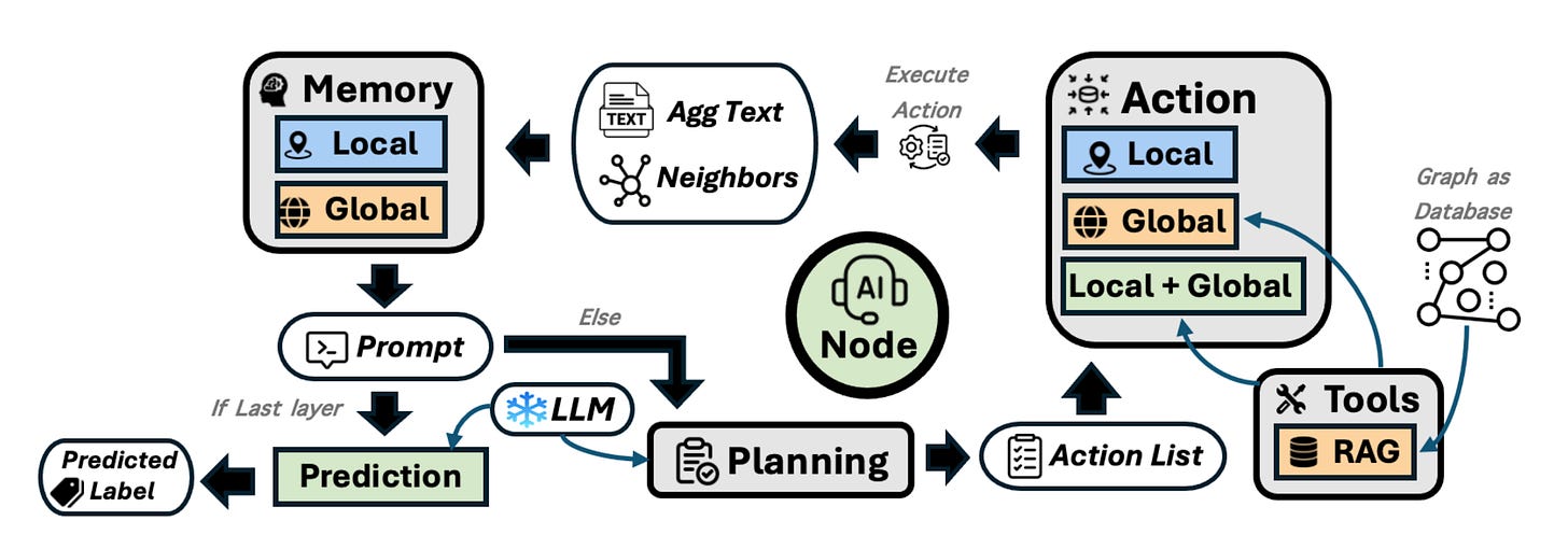 The node’s action space includes Local Aggregation (structured neighbors), Global Aggregation (via retrieval), Prediction, and NoOp. The latter regulates over-aggregation and reflects the agent’s ability to opt out when sufficient context exists.