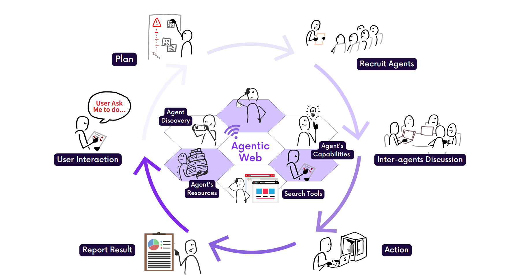 From static browsing to agentic delegation: The Web transitions from human-led navigation (PC era) and feed-based content discovery (Mobile era) to agent-driven action execution. Here, users delegate intents like “plan a trip” or “summarize recent research,” and agents autonomously orchestrate multi-step workflows across services and platforms.
