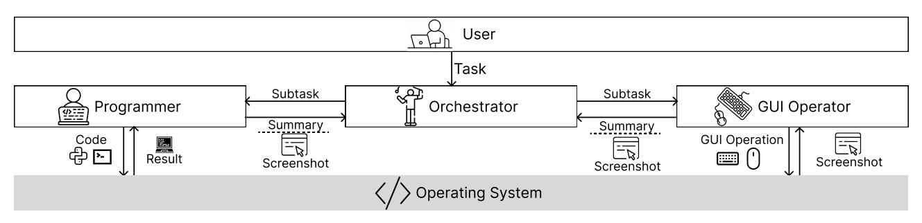 Hybrid multi-agent architecture – The Orchestrator dynamically assigns subtasks; the Programmer writes/executes scripts for backend operations; the GUI Operator handles visual, interactive tasks. This dual-modality cuts down steps and reduces visual grounding errors.