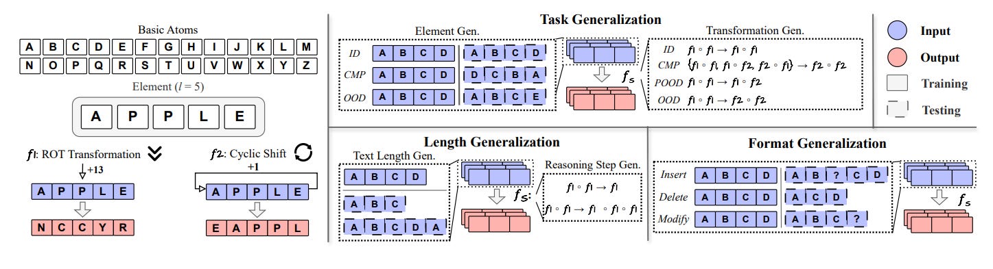 Findings on task generalization – Performance collapses when faced with novel transformations or element combinations, even under mild shifts. Correct intermediate steps often yield wrong final answers, exposing unfaithful reasoning. Minimal supervised fine-tuning on unseen data can “patch” performance, but this reflects expanded in-distribution coverage, not true generalization.