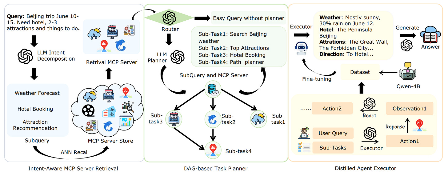 Distilled Agent Executor uses a small, latency-optimized agent fine-tuned via a “mixed-rationale” method, training with chain-of-thought but inferring without it. This achieves near-teacher-level performance with dramatically lower cost. For example, a distilled Qwen3-4B model outperforms GPT-4o and its own teacher model (Deepseek-V3) in tool-use accuracy (88.3% vs. 81.7%) while reducing latency from 6.8s to 750ms.
