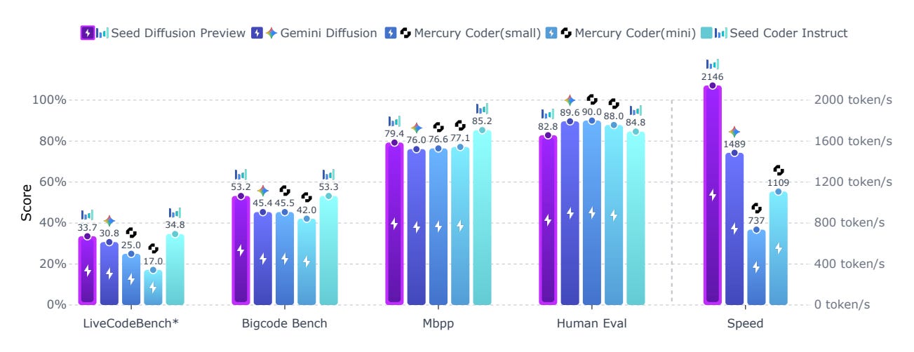 Researchers from ByteDance and Tsinghua University introduce Seed Diffusion Preview, a discrete-state diffusion-based LLM optimized for code generation, achieving 2,146 tokens/sec on H20 GPUs while maintaining competitive benchmark performance. Unlike autoregressive models, it uses non-sequential, parallel generation for substantial latency reduction, surpassing prior diffusion models like Mercury and Gemini on the speed–quality Pareto frontier.