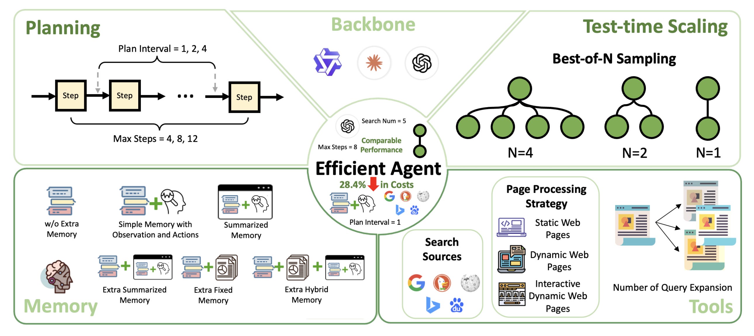 This paper presents Efficient Agents, a new agent framework that achieves a strong efficiency-effectiveness balance in LLM-driven systems. The authors perform the first systematic study of agent design choices through the lens of economic efficiency, specifically, the cost-of-pass metric, which captures the expected monetary cost of solving a task. Their proposed agent retains 96.7% of OWL’s performance on the GAIA benchmark while cutting costs by 28.4%.
