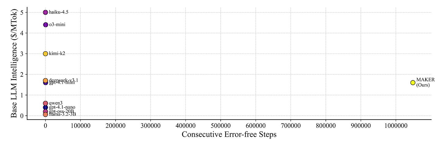 Benchmark validation on complex tasks: Successfully handles tasks like the Towers of Hanoi and other multi-step logical problems that previously became derailed after at most a few hundred steps. The zero-error execution at the million-step scale represents a qualitative breakthrough in agentic reliability.