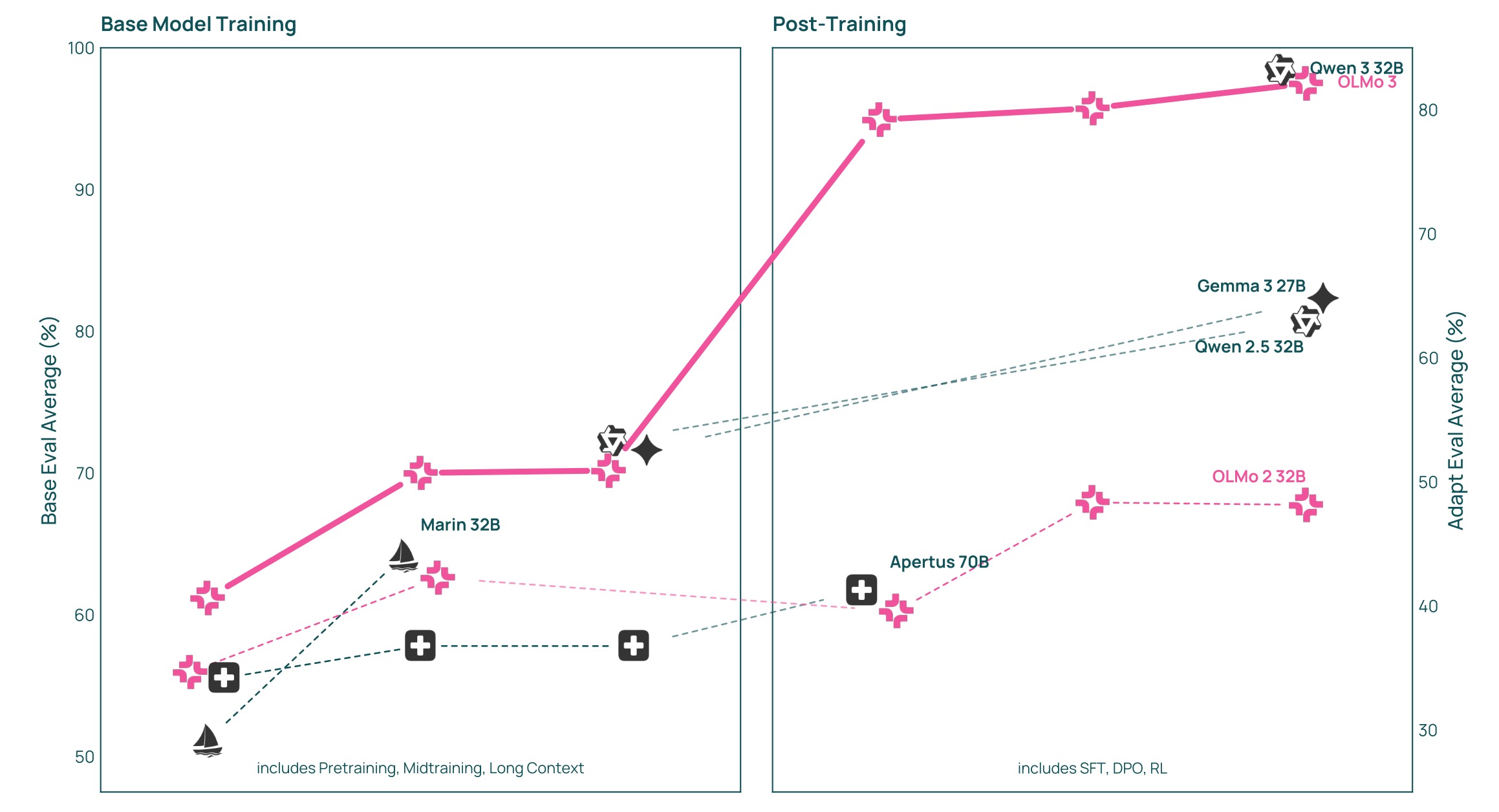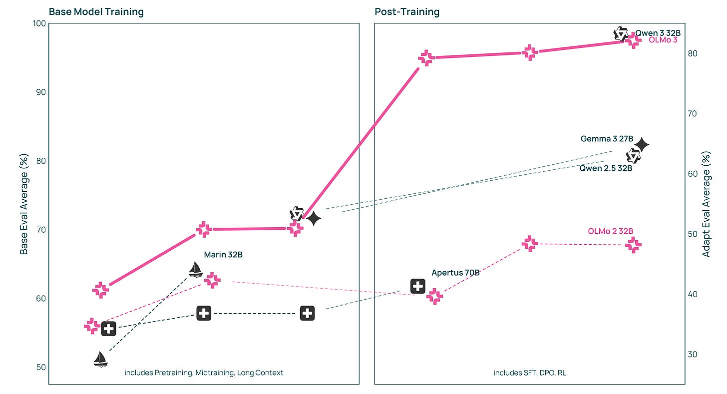 Allen Institute for AI introduces OLMo 3, a fully open language model family that releases the complete “model flow”: every training stage, checkpoint, dataset, and dependency, enabling researchers to intervene at any development point. The release includes four specialized variants (Base, Think, Instruct, RL Zero) at 7B and 32B scales.