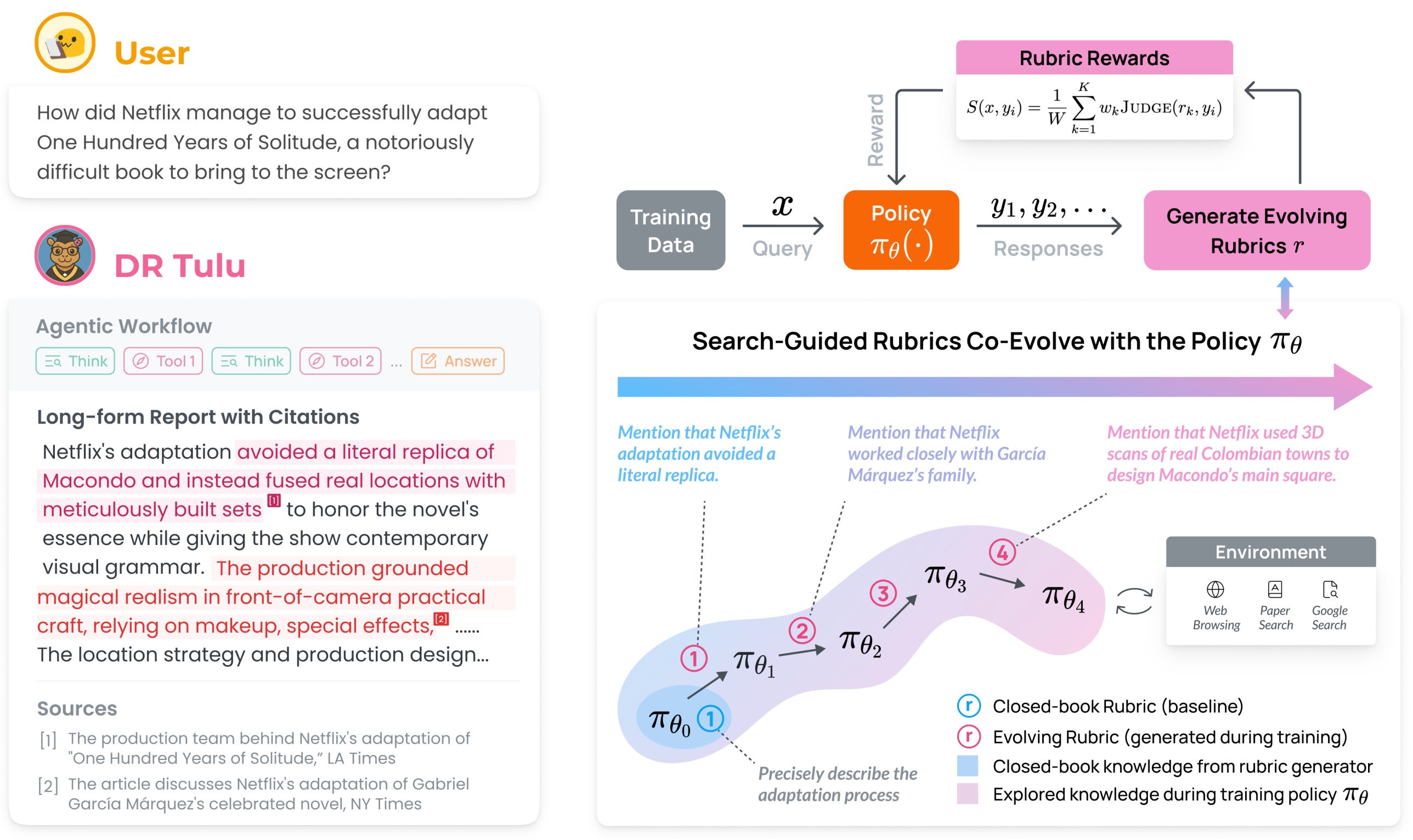 DR Tulu-8B is the first open model directly trained for long-form deep research using Reinforcement Learning with Evolving Rubrics (RLER). Unlike existing models trained on short-form QA tasks, DR Tulu learns to produce comprehensive, well-attributed research reports by training with rubrics that co-evolve with the model and are grounded on real-world searched knowledge.