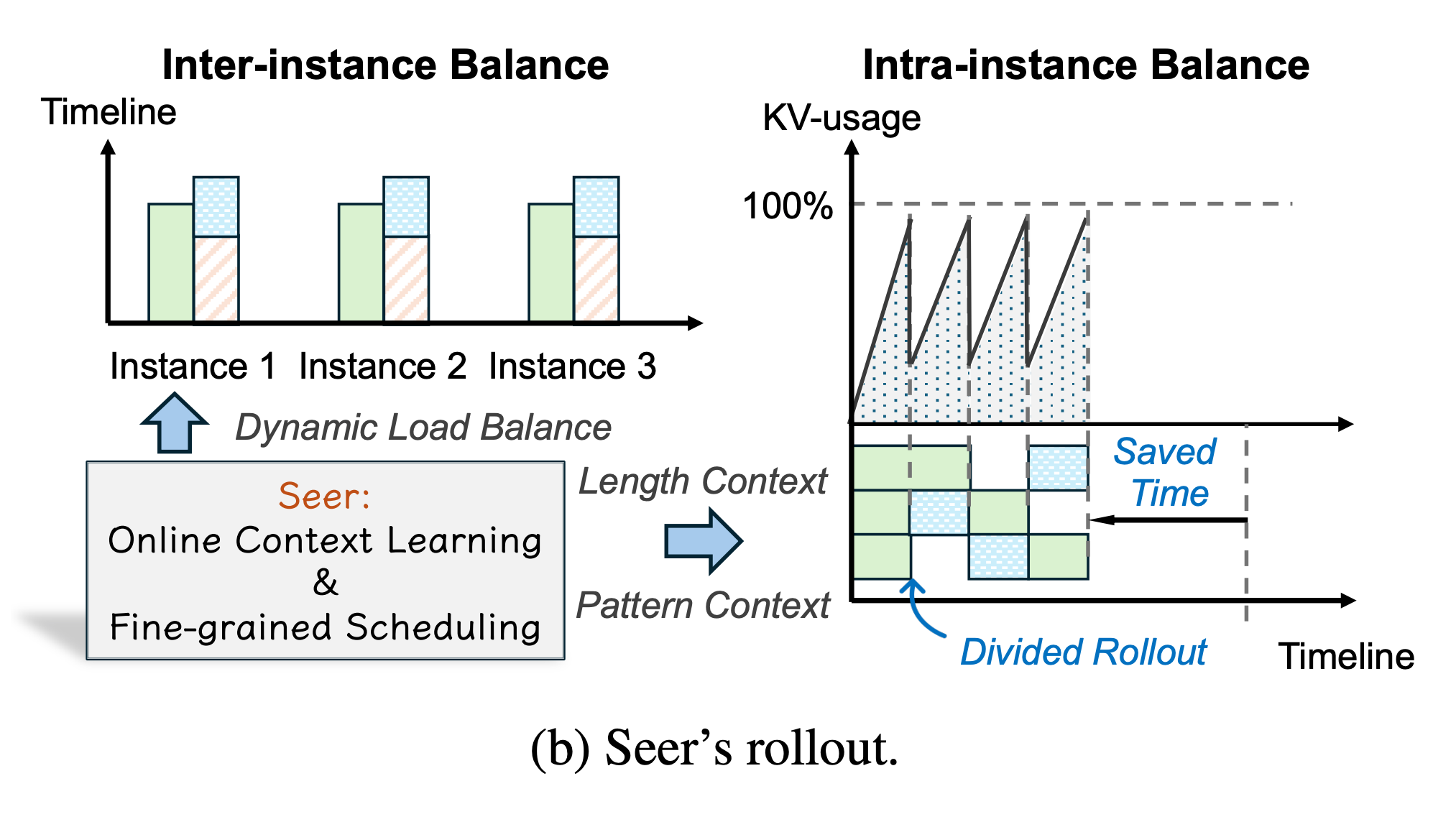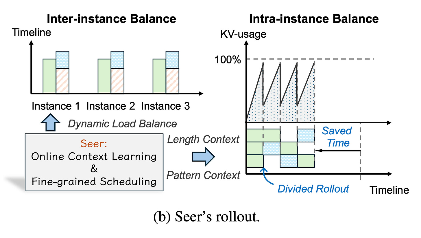 Researchers introduce Seer, a system addressing performance bottlenecks in synchronous reinforcement learning for LLMs by optimizing the rollout phase that dominates end-to-end iteration time. Through three core mechanisms: divided rollout, context-aware scheduling, and adaptive grouped speculative decoding, Seer achieves 74-97% improvement in rollout throughput and 75-93% reduction in long-tail latency on production-grade RL workloads.
