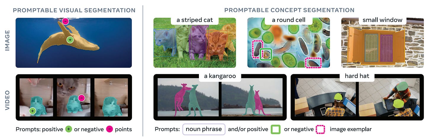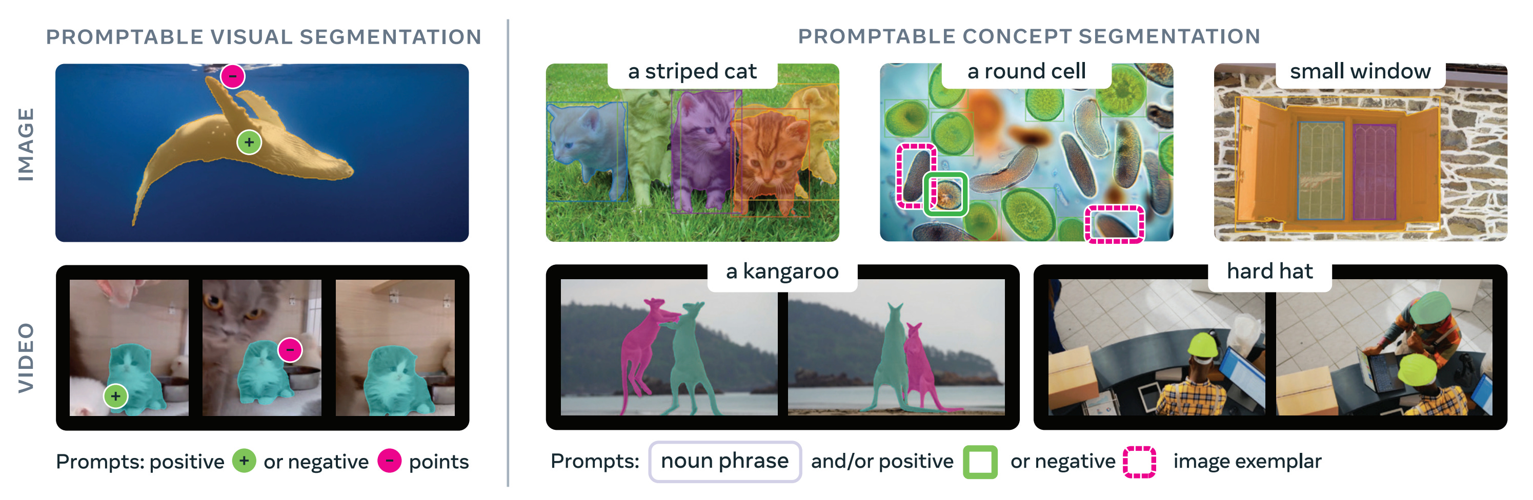 Meta AI introduces SAM 3, a unified model that detects, segments, and tracks objects across images and videos using conceptual prompts like noun phrases or visual examples. This extends the Segment Anything capability to concept-based segmentation through Promptable Concept Segmentation (PCS).