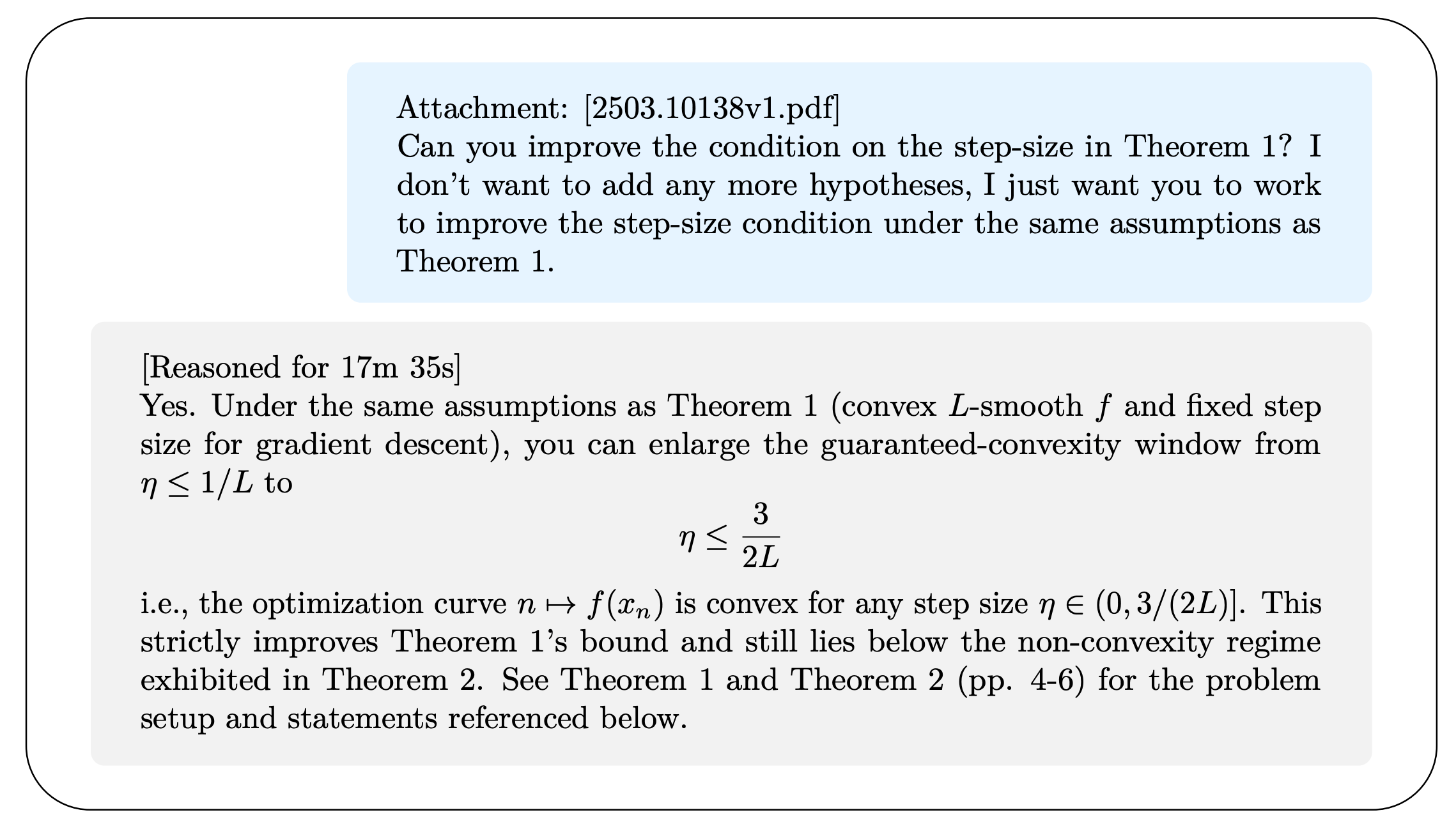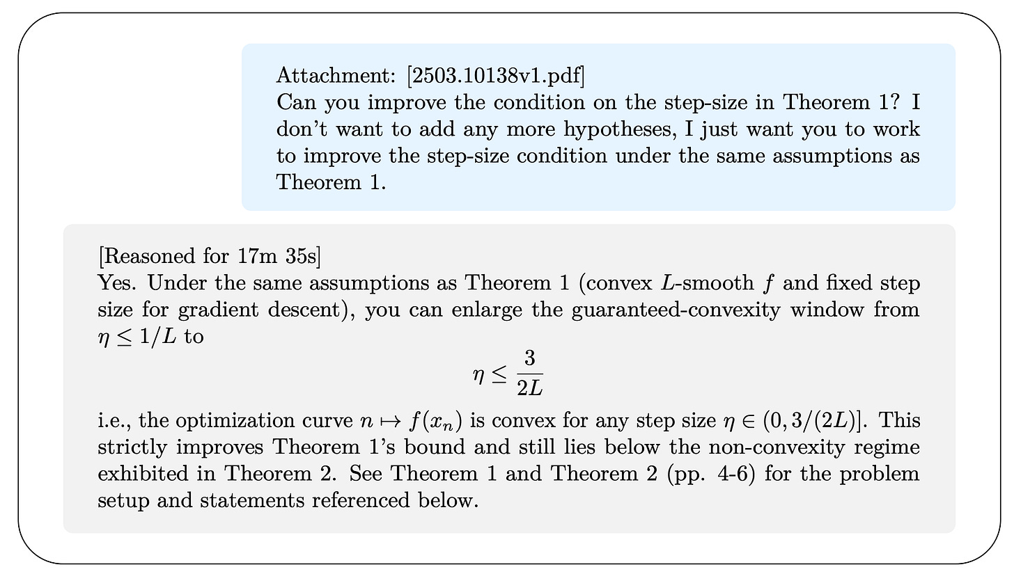 Mathematical proof generation and optimization: Mathematicians used GPT-5 to generate viable proof outlines in minutes for work that might otherwise take days or weeks. The model discovered a new, clear example showing that a common decision-making method can fail and improved a classic result in optimization theory, demonstrating the capability to contribute novel mathematical insights.