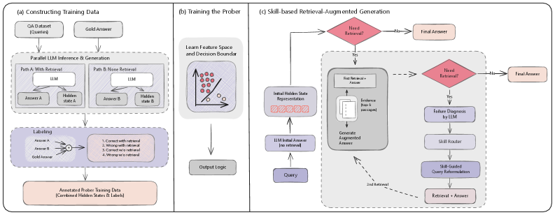 Hidden-state probing as a retrieval trigger: Skill-RAG trains a lightweight probe on the LLM’s hidden representations that predicts whether the model is about to fail the query. Only queries that clear the probe’s failure threshold trigger retrieval, which cuts unnecessary search calls while preserving answers for the cases that actually need help.