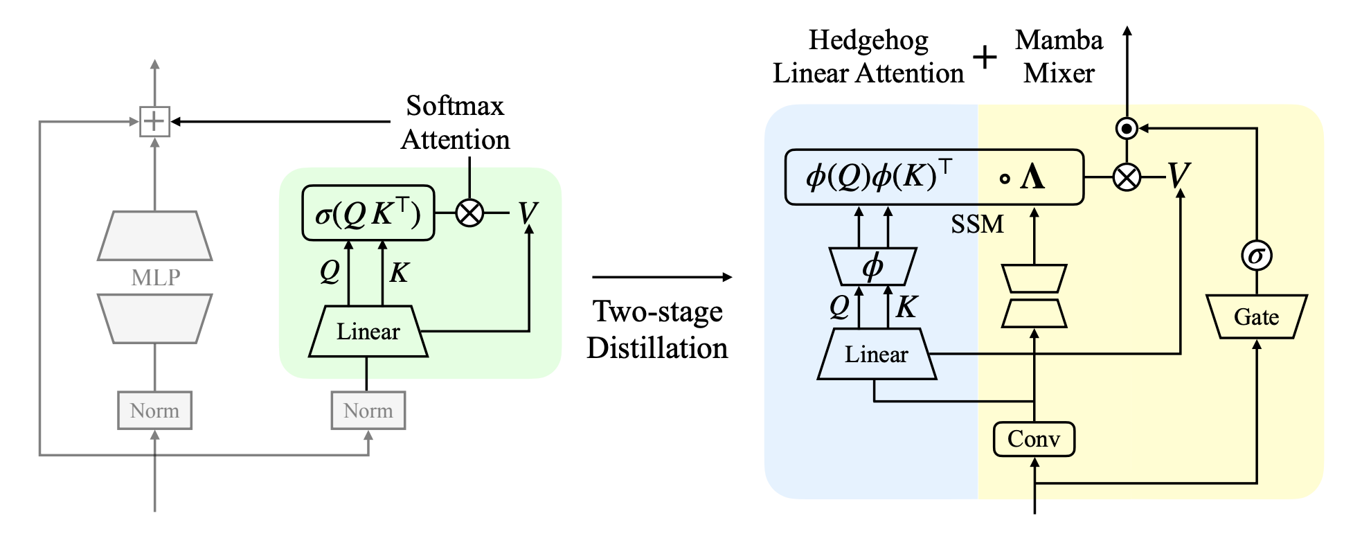 Stage 2, linear attention to Mamba: The second stage transfers the linearized student into a HedgeMamba block, a hybrid SSM architecture that reuses the learned linear attention parameters and adds state-space components. The transition preserves quality because the two formulations are mathematically related, not just structurally similar.