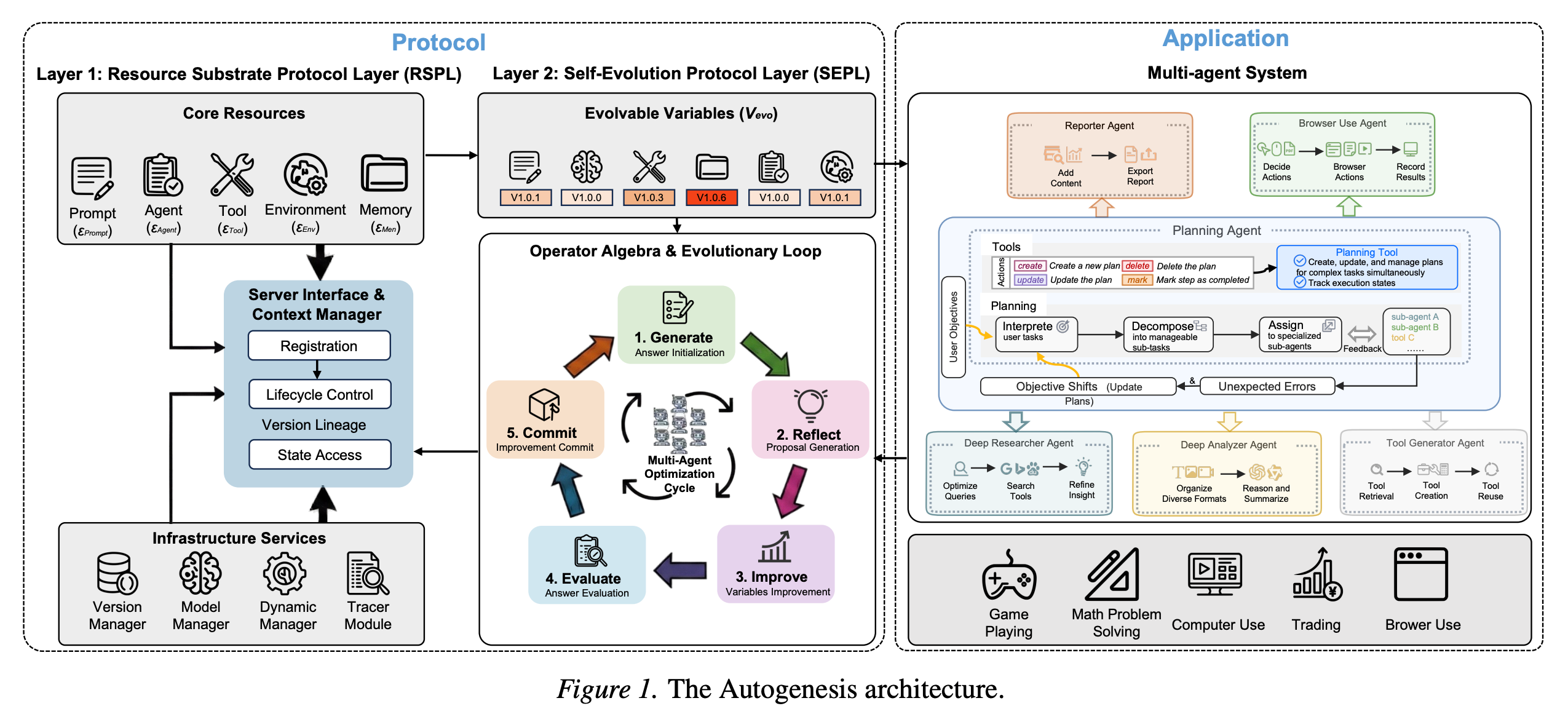 Two-layer protocol design: Autogenesis separates a Resource Substrate Protocol Layer (RSPL) that standardizes access to prompts, tools, environments, and memory from a Self-Evolution Protocol Layer (SEPL) that runs a Generate, Reflect, Improve, Evaluate, Commit loop over evolvable variables. The split keeps core capability registration stable while evolution happens on top.