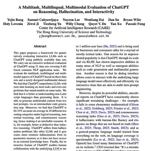 7). Multitask, Multilingual, Multimodal Evaluation of ChatGPT - performs a more rigorous evaluation of ChatGPt on reasoning, hallucination, and interactivity. (paper)